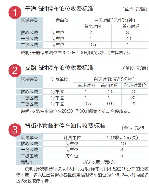 其中,城区道路(含主干道、次干道和支路)停车实行计时收费,背街小巷临时停车泊位实行计次收费,计次收费每次以12小时为限。