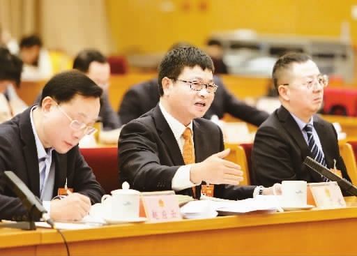 3月9日,胡建文代表(中)为完善我国现行养老制度建言献策。 湖南日报记者 赵持 摄