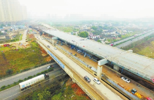 3月22日,长沙市新建的湘府路高架桥跨越京港澳高速。21日,湘府路快速化改造工程主线高架香月路至京港澳高速段完成预制钢板组合梁架设,实现主体贯通。工程开始转入桥面铺装及附属结构施工阶段,预计5月底完工。
