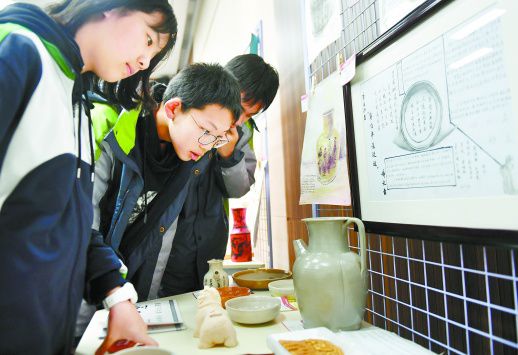 3月22日,初一学生在欣赏自制的“国宝”。当天,长沙博物馆与青竹湖湘一外国语学校联合举行“国家宝藏”系列活动成果展,展出学生近3个月来制作的97件(套)“国宝”作品,包括绘画、仿制品、视频和PPT三种类型。活动提升了学生的观察感知、表达、动手与协作能力和保护文物的意识。记者 郭立亮 摄