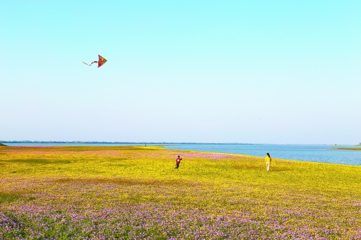 3月25日,益阳市赫山区来仪湖国家湿地公园,市民在湖洲上休闲娱乐。春光明媚,来仪湖湿地粉红的紫云英和金黄的苦荬花遍地绽放,美不胜收。 桂志强 摄