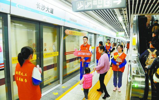 4月11日,长沙地铁二号线长沙大道站,青年志愿者手持宣传牌倡导有序、文明乘车。当天,雨花区开展“排队礼让进地铁 文明礼让伴我行”主题活动,营造长沙文明城市窗口形象。湖南日报记者 徐行 见习记者 欧阳倩 摄影报道