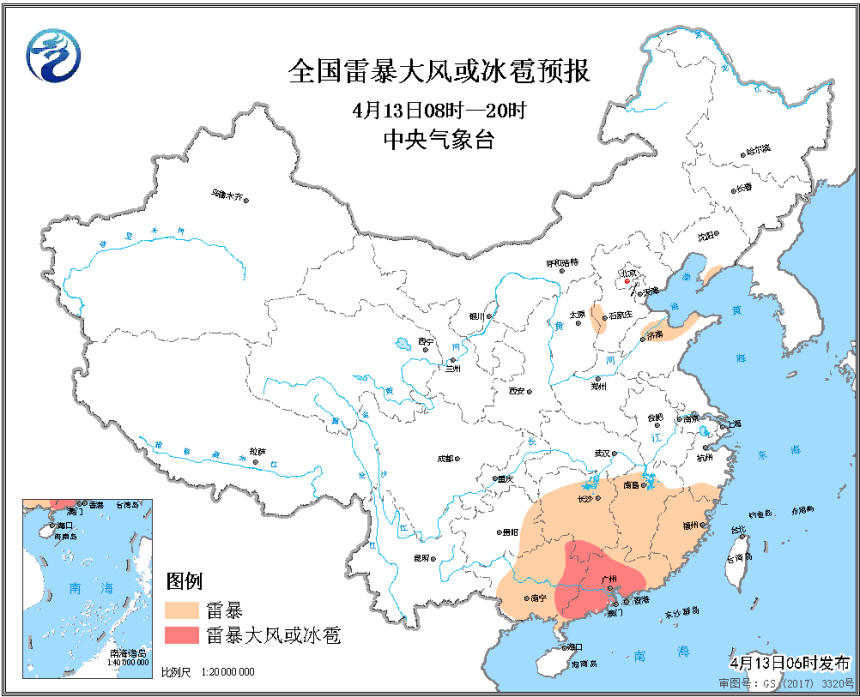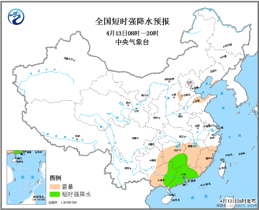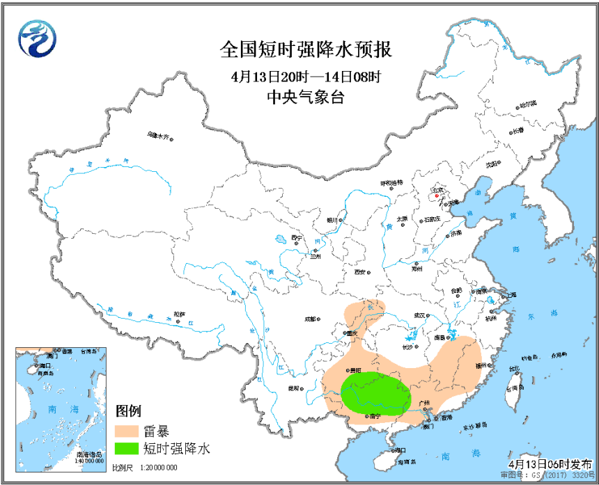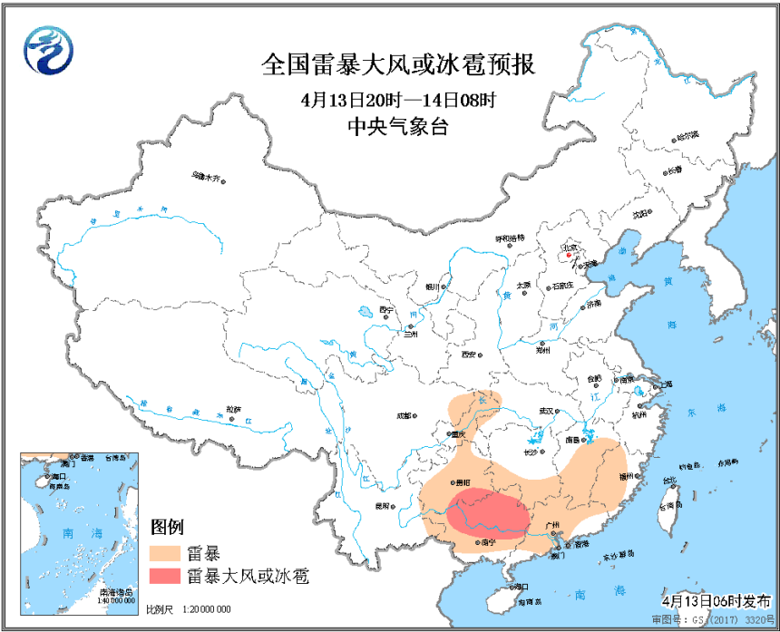 据中央气象台消息,预计4月13日08时至14日08时,贵州东南部、湖南南部、广西大部、广东中西部等地的局地将有8-10级雷暴大风或冰雹天气;此外,贵州东南部、湖南中南部、广西大部、广东大部等地的部分地区将有短时强降水天气,小时雨强20-40毫米,局地可达60毫米以上。