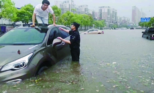 4月19日16时许,怀化市天星路体育中心北大门,一名被积水围困的市民在民警的帮助下从车辆天窗爬出,脱离险境。当天下午,该市突降暴雨,城区部分路段出现积水。
