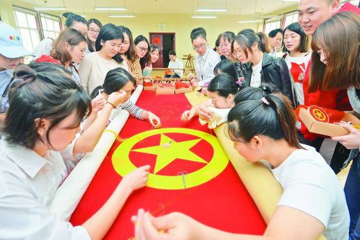 4月20日,湖南省湘绣研究所,青年人在绣制团旗。当天,来自多个行业的100名优秀青年走进湖南省湘绣研究所,学习湘绣的基础技法,共同完成一幅手工绣制的巨幅团旗,纪念五四运动100周年。 湖南日报记者 李健 摄