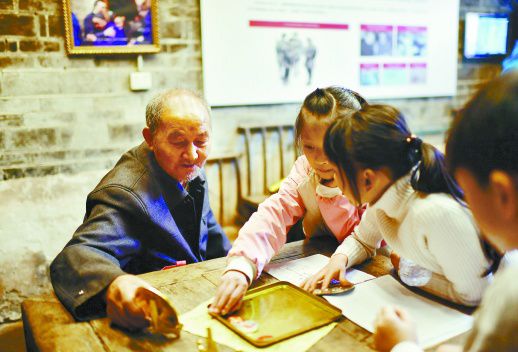 4月13日,沙洲村徐解秀故居,徐解秀老人的小儿子朱中雄为小朋友们作讲解。