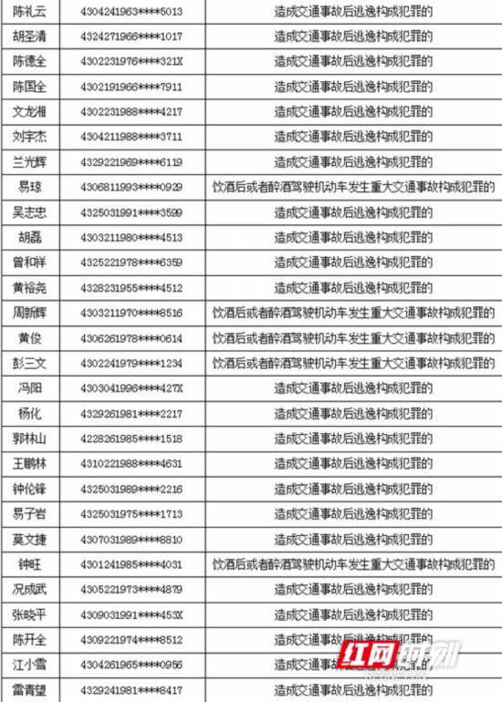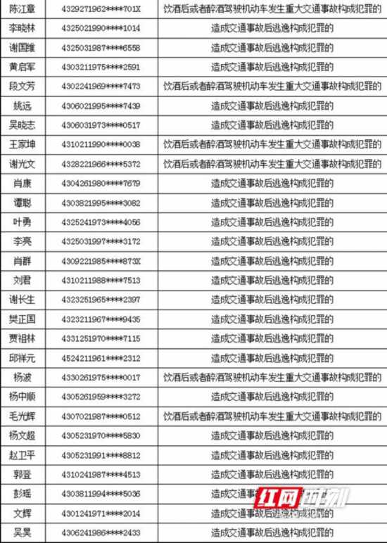 5月20日,湖南省公安厅交警总队联合各市州公安局交警支队,曝光2019年1-4月份以来157人终生禁驾人员名单,并列入黑名单实施动态监管。一旦发现其中有人再次申领机动车驾驶证,系统将会自动锁定不予办理相关业务。