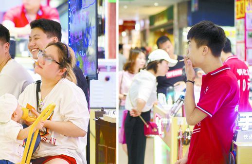 5月31日,长沙市黄兴路步行街一商场,一名女士一边给孩子喂水一边旁若无人地抽烟(左图),一名青年则边抽烟边揽客(右图)。当天是世界无烟日,不少单位都开展了控烟、戒烟宣传活动,但在长沙市的不少公共场合,仍可以看到一些人在肆意“过瘾”。希望广大烟民增强公德意识和健康意识,自觉控烟。