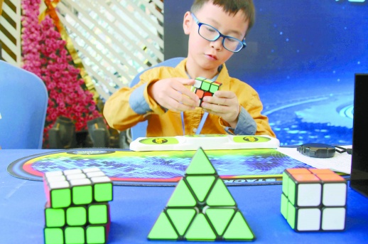 6月1日,一场魔方大赛在江苏省苏州市绿宝广场举行,吸引全市300多名小学生同台竞技。图为当日,小选手在魔方大赛上比拼。本版图片均为新华社发