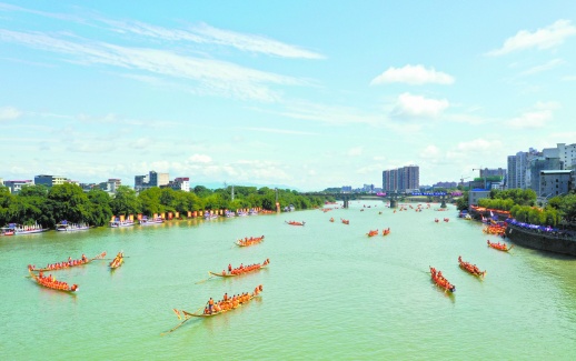 6月2日,潇水河道县县城段,参赛队伍在训练。当天,来自全县各乡镇、街道的144艘龙船、3400余名龙船队员,在潇水河道县县城段河面竞逐,积极备战“龙腾潇湘·2019”湖南省传统龙船赛(道县站)决赛。何红福 摄