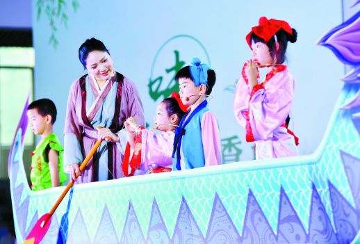 6月6日,孩子们和老师一起表演情景剧。当天,长沙市开福区教育局第三幼儿园主办“传承民俗文化、乐享游戏童年——我们的节日·端午”民俗游戏活动。湖南日报记者 田超 摄
