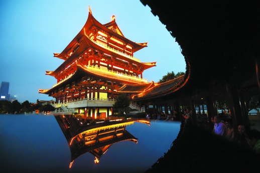 6月17日晚,长沙市杜甫江阁在灯光的点缀下格外美丽(利用手机屏幕镜面反射拍摄)。为迎接第一届中非经贸博览会,杜甫江阁阁楼部分区域于上月开始维护施工,主要进行建筑物外部美化、亮化。目前,杜甫江阁维护工作已经完工,全部对外开放。湖南日报记者 田超 摄