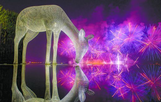 6月26日晚,小鹿雕像与璀璨烟花相映,美轮美奂。当晚,为庆祝首届中非经贸博览会的召开,一场数字影像艺术焰火秀在长沙橘子洲上空上演。焰火秀分《有朋自远方来》《多彩非洲》《美丽中国》《锦绣潇湘》《相约长沙》《共享未来》6个篇章,将激光、灯光、LED影像等多媒体艺术与焰火完美融合,充分展示了长沙媒体艺术之都的魅力。湖南日报记者 唐俊 通讯员 宋乐平 摄影报道