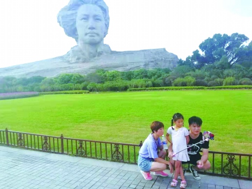 7月22日,因洪水闭园2周的橘子洲景区重新开园,截至下午5点,景区游客达到1万人左右。 “之前在网上看到因为涨水,橘子洲景区关闭了,今天才开园。长沙的朋友都推荐来橘子洲看看,今天就带着孩子来玩。”来自贵州的翟先生和妻子孩子玩起了自拍。(记者 石芳宇 实习生 周文卓 谢文慧 摄影报道)