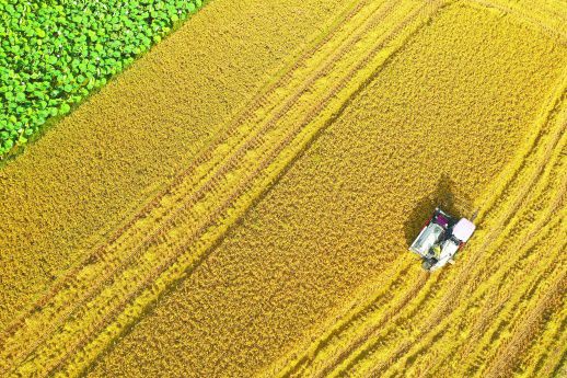 7月23日,道县梅花镇贵头村,农民驾驶农机收割早稻。何红福 摄