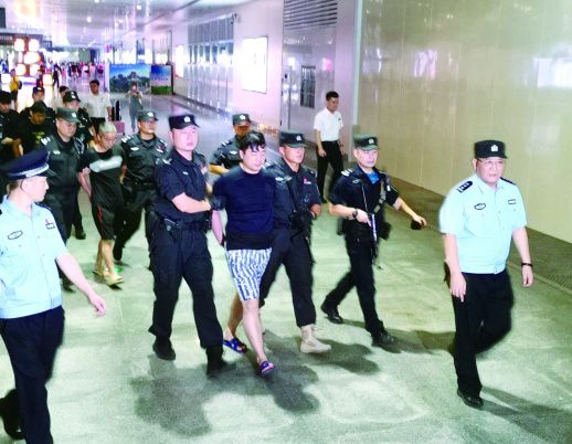 8月7日20时30分,长沙火车南站,A级通缉犯陆海洋被特警押解回长。(记者 杨洁规 摄)