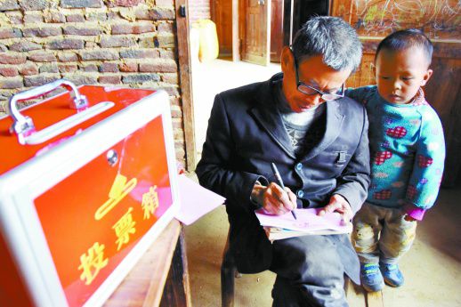 图③ 2016年10月25日,双峰县井字镇三石村选区,选民在流动票箱前认真填写选票。当年10月24日至29日,该县开始进行县乡人大代表换届选举,选出新一届县级人大代表300余名和乡镇人大代表1200名。(资料图片)李建新 摄