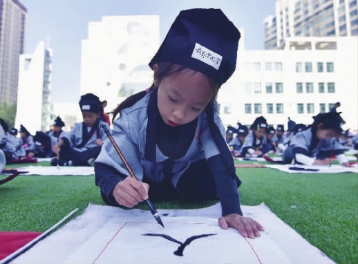 9月1日,全国多地小学校迎来开学第一天。当天,青海省西宁市文汇小学一年级的学生在“开笔礼”仪式上书写“人”字。 新华社 图