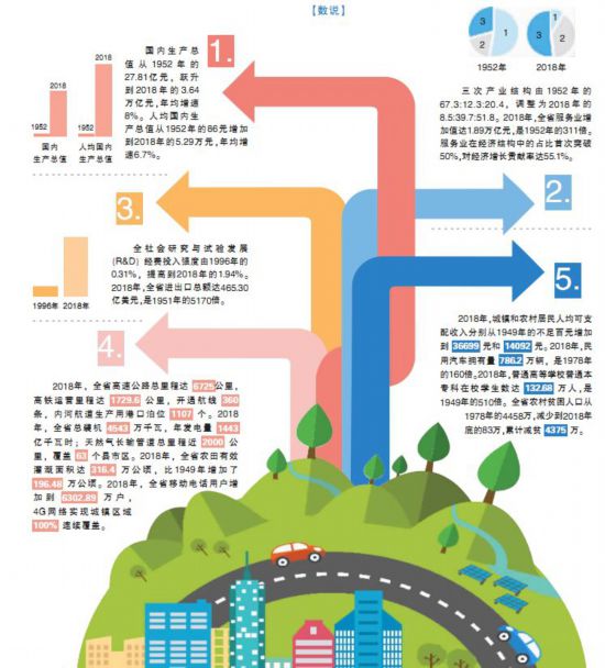 如今,全省经济结构发生重大变化,经济发展质量和效益明显提升。全省三次产业结构由1952年的67.3∶12.3∶20.4,调整为2018年的8.5∶39.7∶51.8。