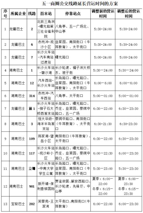 此方案的制定,是以五一商圈为中心,综合考虑覆盖湘江大道、解放西路、黄兴路等片区。加强了五一商圈周边五一广场北、五一广场、太平街口、南阳街口、贾谊故居、八角亭等几个主要客流集散点的联系。同时基本能覆盖全市各个方向(包括星沙)和尽量满足市民和游客的出行需求。(记者 石芳宇)
