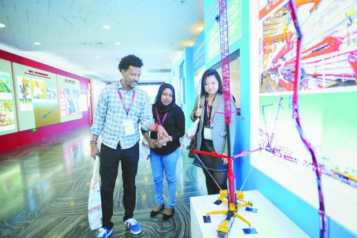 小图:9月12日下午,湖南70年成就展在外交部蓝厅外展出。图为外国记者在三一重工机械产品模型前驻足观看。
