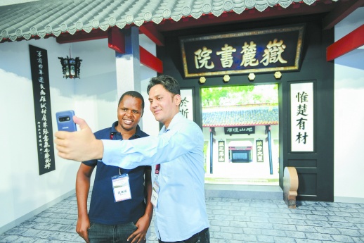 9月12日下午,湖南70年成就展在外交部蓝厅外展出,两名外国记者在岳麓书院模型外拍照留影。
