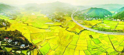 9月13日,岳麓区雨敞坪镇,金黄色的稻田与房屋、公路交相辉映,把乡村装扮得格外美丽。 湖南日报记者 李健 摄