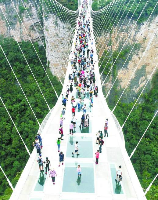 9月14日,位于张家界大峡谷风景区的高空峡谷玻璃桥以“凌空漫步,如履薄冰”的惊险体验,成为当地中秋假期旅游的“网红”景点,吸引各地游客纷至沓来。(吴勇兵 罗克文 摄影报道)