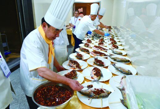 9月19日,各地厨师在2019食餐会开幕式现场展示拿手厨艺。当天,2019中国国际食品餐饮博览会开幕式暨中国国际餐饮文化品鉴会在长沙举行。(记者 徐行 摄)