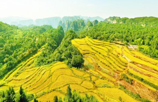 9月23日,张家界武陵源风景区袁家界空中田园,梯田里稻谷金黄,与武陵源峰林构成一幅壮美画卷。