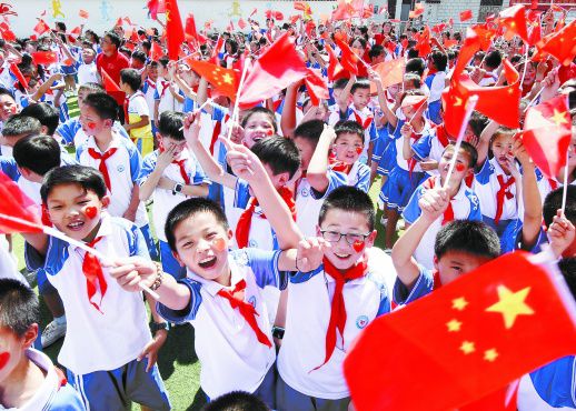 9月25日,嘉禾县珠泉完全小学,师生激情高歌《我和我的祖国》。当天,该校开展“放歌新时代 深情颂祖国”喜迎国庆系列活动,4000余名师生一起手舞国旗,深情高歌,庆祝新中国成立70周年。黄春涛 摄
