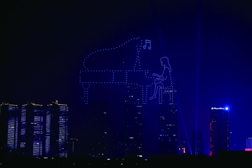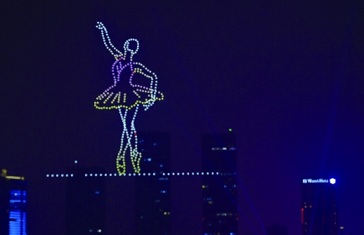 10月12日晚,长沙市橘子洲上空,无人机在空中变换出“跳芭蕾”、“钢琴演奏”等造型。当天,无人机艺术秀在橘子洲上演,给长沙市民带来了一场奇幻灯光秀。记者 田超 摄