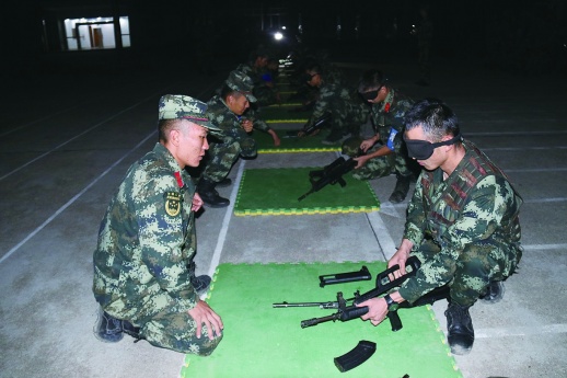 10月11日,武警湖南总队第三季度“魔鬼周”极限训练在长沙、岳阳、湘西、邵阳、湘潭五地同步展开。图为无光条件下的步枪分解结合科目,主要检验特战队员对手中武器的熟悉程度。记者 石芳宇 通讯员 展灿 摄影报道
