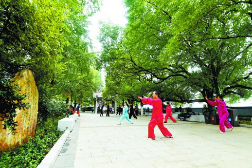 10月11日,长沙湘江风光带杜甫江阁以北段,市民在打太极拳。从今年7月开始,长沙湘江东岸防洪综合改造项目启动风光带景观绿化修复工程,分为南北两段进行,施工主要包括堤顶铺装、围栏改造、夜景亮化等。最近,北段5.1公里长的风光带已完工并对外开放,成为生态优美的沿江“画廊”。湖南日报记者 田超 摄