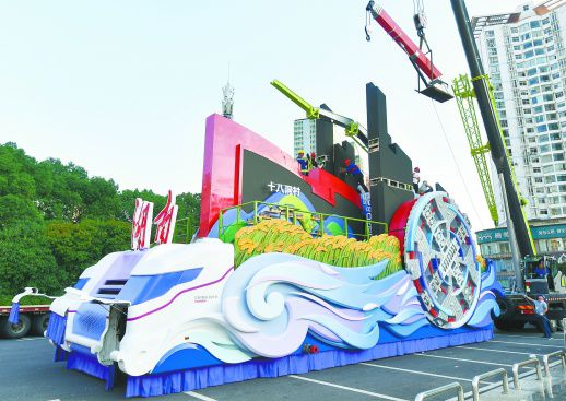 10月21日傍晚,长沙新世纪体育文化广场,工作人员在安装湖南彩车“潇湘今朝”。该彩车长15米、宽6米、高10米,重27.995吨,将湖南的人文景观、自然景观和新型工业化发展成果融为一体,10月1日在北京参加了庆祝中华人民共和国成立70周年大会。彩车通电调试到位后,将于10月23日至12月31日向公众进行展示。(记者 田超 摄)