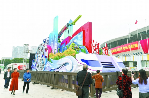 10月23日,长沙市贺龙体育中心,市民在参观“潇湘今朝”湖南彩车。记者 田超 摄