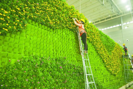 10月23日,第二十一届中国中部(湖南)农业博览会布展现场,工作人员在布置造型花卉墙。(记者 徐行 摄)