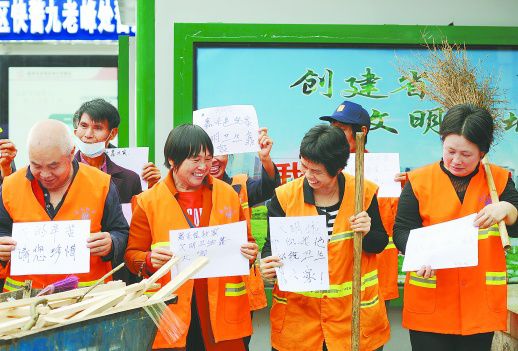 10月24日,嘉禾县晋屏大道,环卫工人在展示自己的心里话。当天,该县环境卫生中心开展“说说心里话,表表微心愿”活动,让环卫工人说出自己的心声,喜迎我省第24个环卫工人节。黄春涛 摄