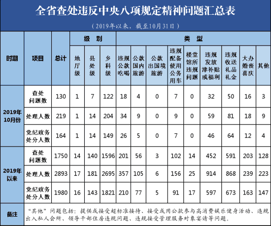 湖南省纪委省监委深入贯彻中央纪委国家监委工作部署,认真落实中央八项规定精神情况月报制度。2019年以来,截至10月31日,全省查处违反中央八项规定精神问题情况如下: