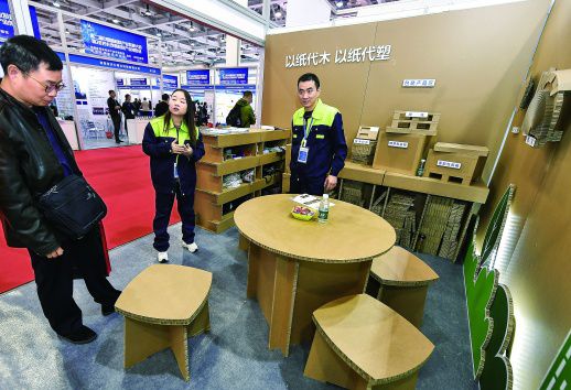 上图:11月14日,湖南国际会展中心,华望科技股份有限公司展示的用蜂窝纸拼接成的桌子、凳子,承重可达100公斤。均为湖南日报记者 辜鹏博 唐俊 摄影报道