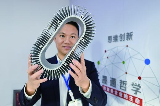 上图:11月14日,湖南国际会展中心,晟通科技集团有限公司工作人员展示铝制LED散热器。