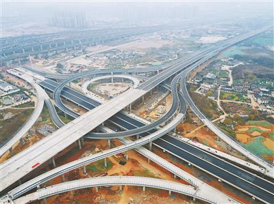 12月17日,长沙湘府路快速化改造工程武广高铁以东路段高架主体结构正进行桥面附属设施及沥青摊铺施工。该工程预计明年上半年完工。届时,长沙湘府路高架全线通车,车辆从河西前往长沙火车南站将实现全程无红绿灯,大大缩短出行时间。红旗路立交桥采用苜蓿叶型设计,匝道线型优美,规模宏大。(记者 徐行 摄)