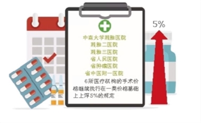 为衔接原物价政策,“湘雅名医”“一级主任医师”“湖南省名中医”以及“全国老中医药专家学术经验继承工作指导老师”门诊诊查费继续执行300元/次;中南大学湘雅医院、湘雅二医院、湘雅三医院、省人民医院、省肿瘤医院、省中医附一医院6所医疗机构的手术价格继续执行在一类价格基础上上浮5%的规定(项目说明中标明可加收的项目,其加收部分不得上浮)。