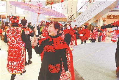 1月4日,湖南雨花非遗馆,剪纸爱好者欢聚一堂,身着各自设计创作的剪纸服饰进行T台展示。当天,长沙市第一届剪纸“春晚”在该馆举办,含有剪纸元素的舞蹈、大合唱、T台秀、情景剧等节目精彩纷呈,展现了湖湘剪纸独具特色的艺术魅力。湖南日报记者 徐行 摄