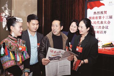 1月12日,怀化市代表团的几位基层代表杨晓琴、丁小林、张秀乾、钟果林和何丽华聚集在一起探讨基层治理的话题。大家不约而同地谈论起湖南日报最近刊发的《探访“湖南基层治理的北斗溪实践”》系列报道。“紧紧依靠群众的力量,北斗溪从偏远山区蝶变为明星乡镇,给我们很大的启示,是咱学习的榜样。”记者 罗新国 摄