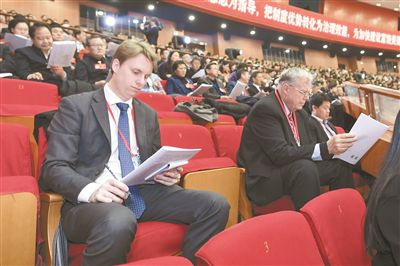1月13日,省十三届人大三次会议在省人民会堂开幕,大会邀请了法国驻武汉总领事馆经济领事(左)、美国驻武汉总领事馆总领事、礼宾助理(右)等外宾旁听。湖南日报记者 辜鹏博 摄
