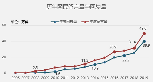 2019年全年,人民网《领导留言板》吸引网民留言近50万件,各级领导干部通过平台回复网民诉求近40万件,留言总量与回复总量的增速均接近60%,创下历史新高。