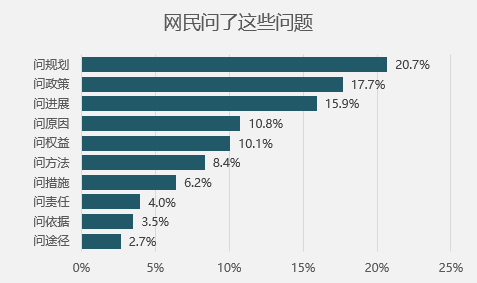 在所有的网民咨询类留言中,各地网民聊得最多的是规划问题,涉及从城市布局、交通出行、棚户区改造,到人才落户、购房补贴、就业安置等各个方面,相关留言占全年留言量的20.7%(见下图)。