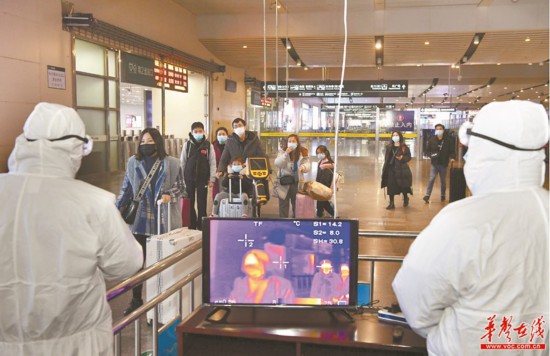 1月27日,高铁长沙南站出站口增设了红外热成像体温快速筛检仪,对到站旅客进行快速测量体温。记者 郭立亮 摄