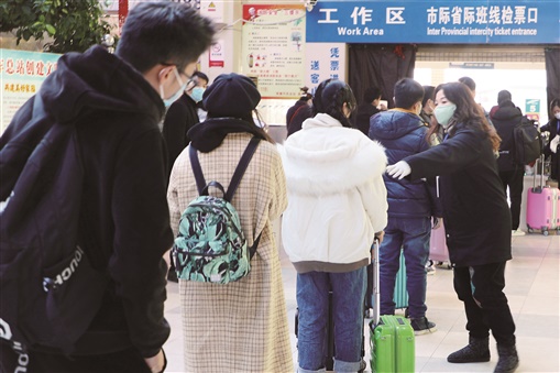 2月9日,常德市汽车总站候车大厅,工作人员提醒旅客保持一米以上的距离排队检票上车。经过提醒后,旅客们都非常自觉地遵守疫情期间“一米距离”的要求。 陈自德 摄